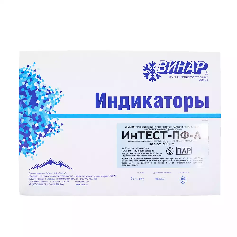Индикатор стерилизации ИНТЕСТ-ПФ-А, универсальный для 3-х режимов, самоклеющийся, упаковка 500 тестов, без журнала, для контроля внутри и снаружи, Винар НПФ