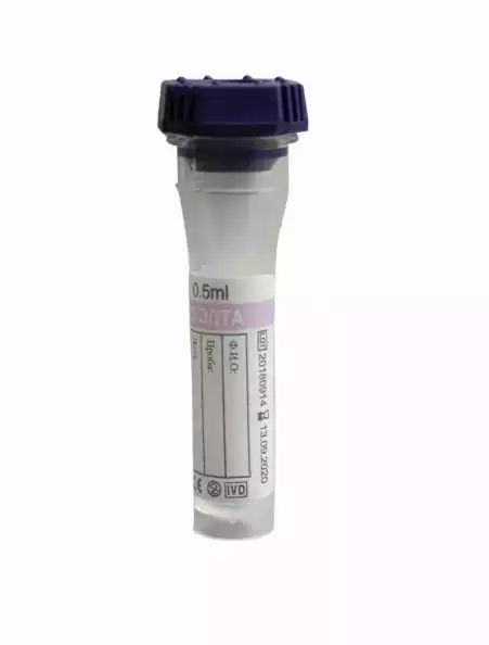Пробирка невакуумная для капиллярной крови стерильная с ЭДТА-К3 0,5мл, размер 10*45мм, с капилляром, цвет резиновой крышки фиолетовый, 100 штук в штативе, Hebei Xinle Sci&Tech Co Ltd, 100 шт