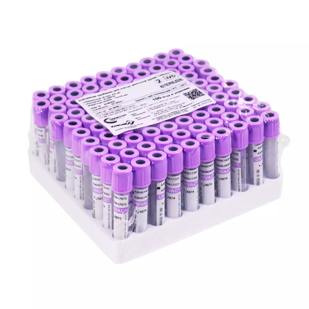 Пробирки вакуумные пластиковые UNIVAC с ЭДТА-К3 объем 4 мл, размер 13*75 мм, цвет крышки фиолетовый, 100 шт