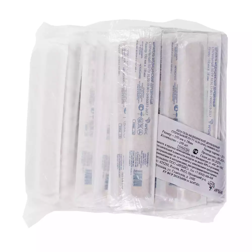 Шпатель медицинский деревянный, размер 150*18*1,8мм, одноразовый стерильный, 100 шт